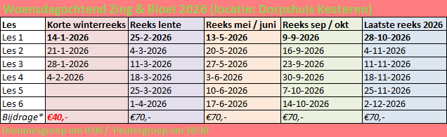 Tussen de schoolvakanties door worden er reeksen van 6 lessen Zing & Bloei gegeven.