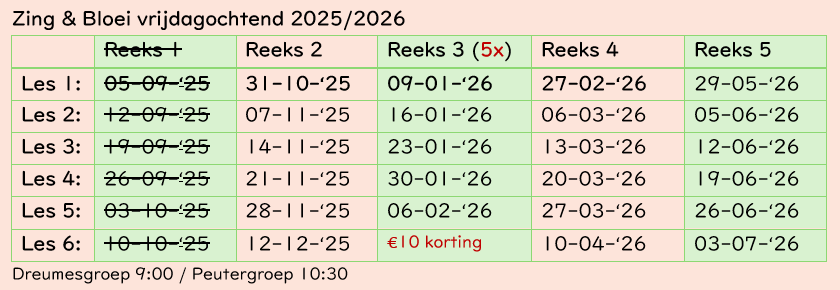 Na elke schoolvakantie start een nieuwe reeks van 6 lessen op de vrijdagochtend.